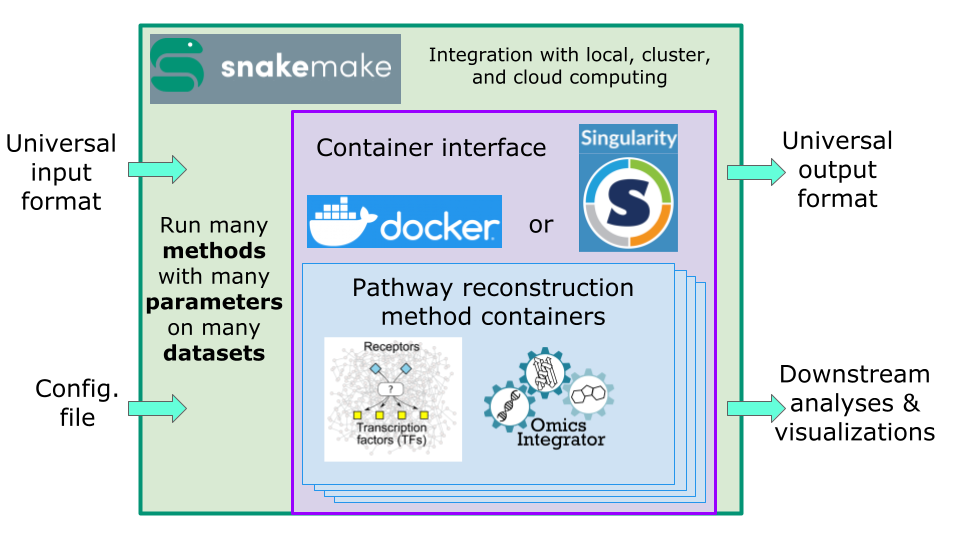 SPRAS is a Python package that builds on Snakemake and Docker to provide a standardized, reproducible, and scalable framework for applying pathway reconstruction methods (PRMs) to omics data.